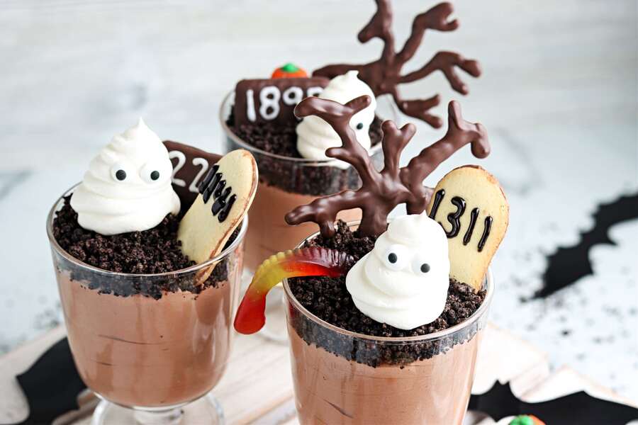 This hauntingly simple dessert is a perennial favorite, blending creamy indulgence with a touch of gothic charm. The foundation is a rich, chocolatey pudding cup, reminiscent of freshly tilled earth. The key is to create layers of flavor and texture. Start by spooning a generous amount of your favorite chocolate pudding into clear glass cups. This forms the "dirt." For an authentic, crumbly texture, crush chocolate sandwich cookies – the ones with the white cream filling work best – and sprinkle them liberally over the pudding. This gives the impression of loose, rocky soil. The final, ghostly touch is the star of the show. Pipe a delicate swirl of whipped cream on top of the cookie layer to form the shape of a ghost. Use 2 tiny, edible candy eyes or miniature chocolate chips to give your ghost a hauntingly cute expression. This dish isn't only delicious but also highly customizable. You can vary the pudding flavors, from classic chocolate to a vibrant orange pumpkin spice, and even add a layer of candy corn or gummy worms for an extra surprise. The contrast between the rich, dark pudding and the light, ethereal whipped cream makes for a perfectly balanced treat that everyone will love.